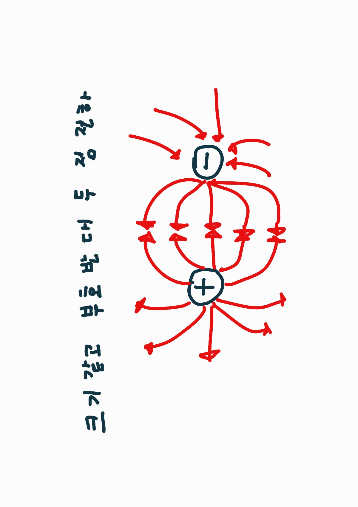 양전하에서 나온 전기력선의 반만이 음전하로 도달하고 나머지는 무한히 먼 곳으로 갑니다.